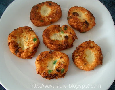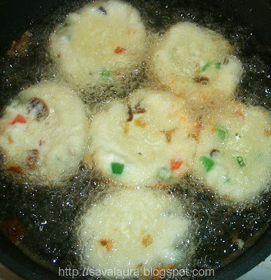 Se face o mica gaura, cu degetul, in mijlocul fiecarui „disc”, si se pun la prajit in tigaia cu ulei incins: