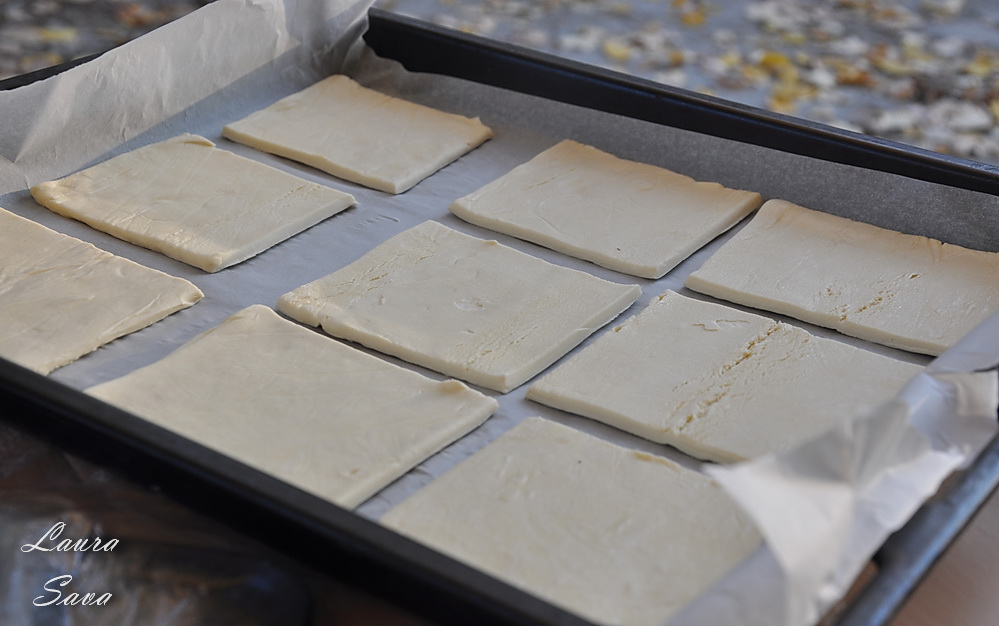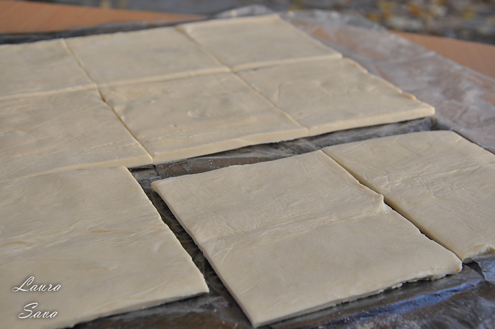 Taiati foile de aluat in 10 sau 12 patrate (cifra nu e exacta deoarece conteaza cat de mari sau mici croiti voi patratele 😀 ):