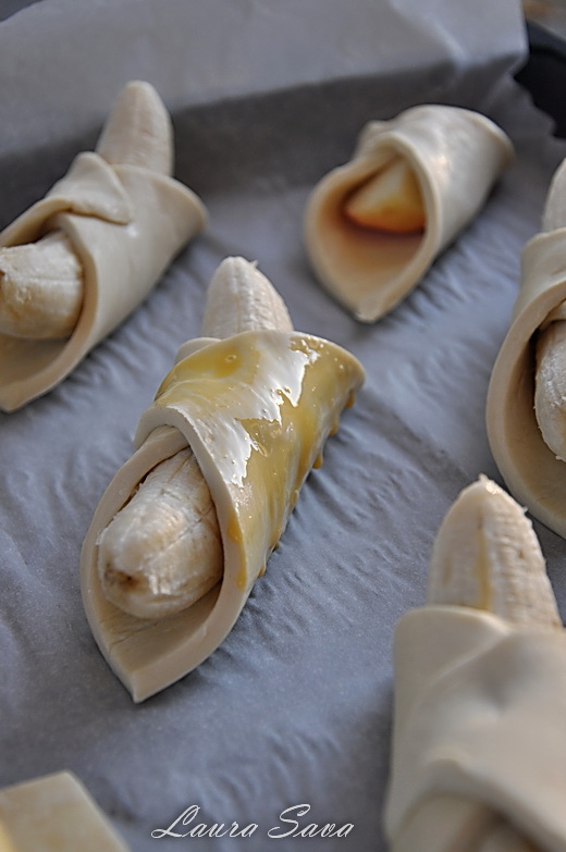Pe fiecare patrat de aluat se aseaza o banana in diagonala (sau cate un sfert de mar):