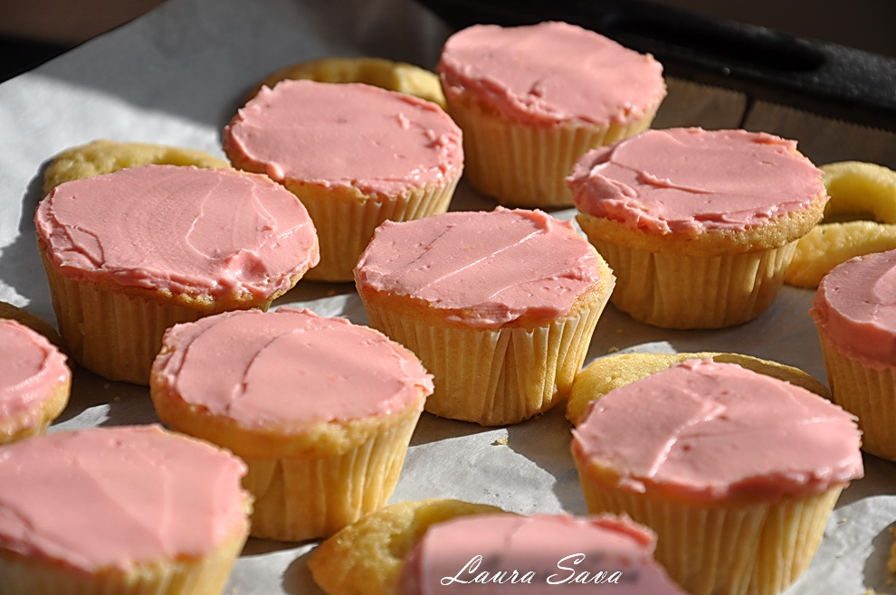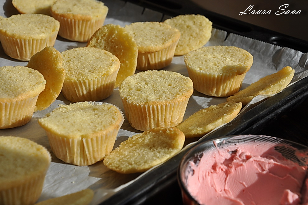 Suprafetele brioselor se ung cu crema. Eu am mai lasat cateva linguri deoparte, pentru ca le-am testat si intr-o alta varianta. Detalii mai jos 😛
