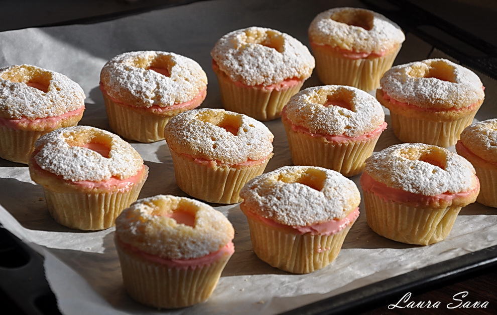 Capacele brioselor se pudreaza cu zahar praf si apoi se aseaza inapoi pe briose, apasand putin: