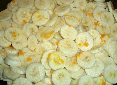 Amestecati intr-un vas bananele, romul (esenta de rom), zaharul si zeama de portocale si turnati „sosul” peste bucatile de banane: