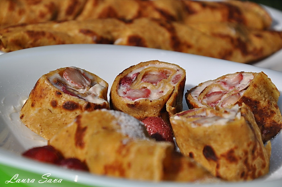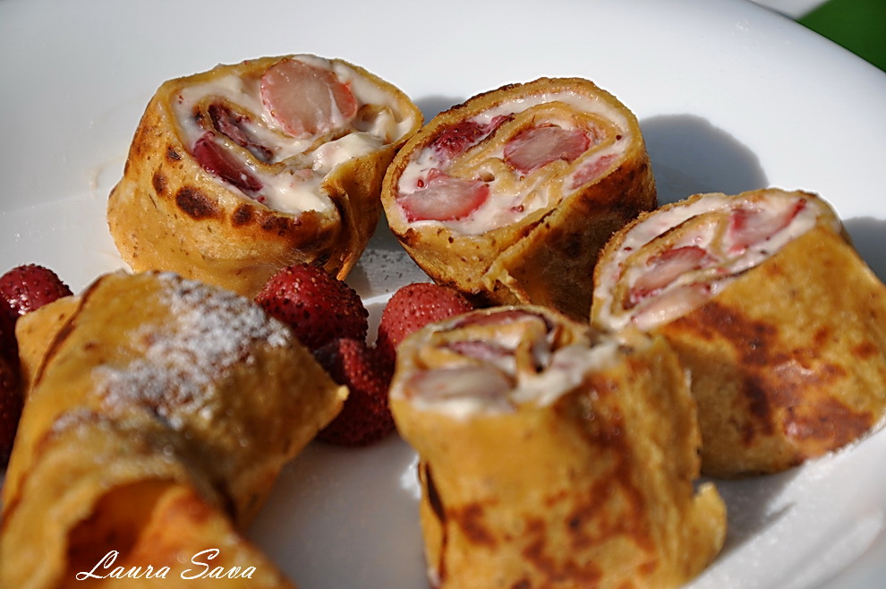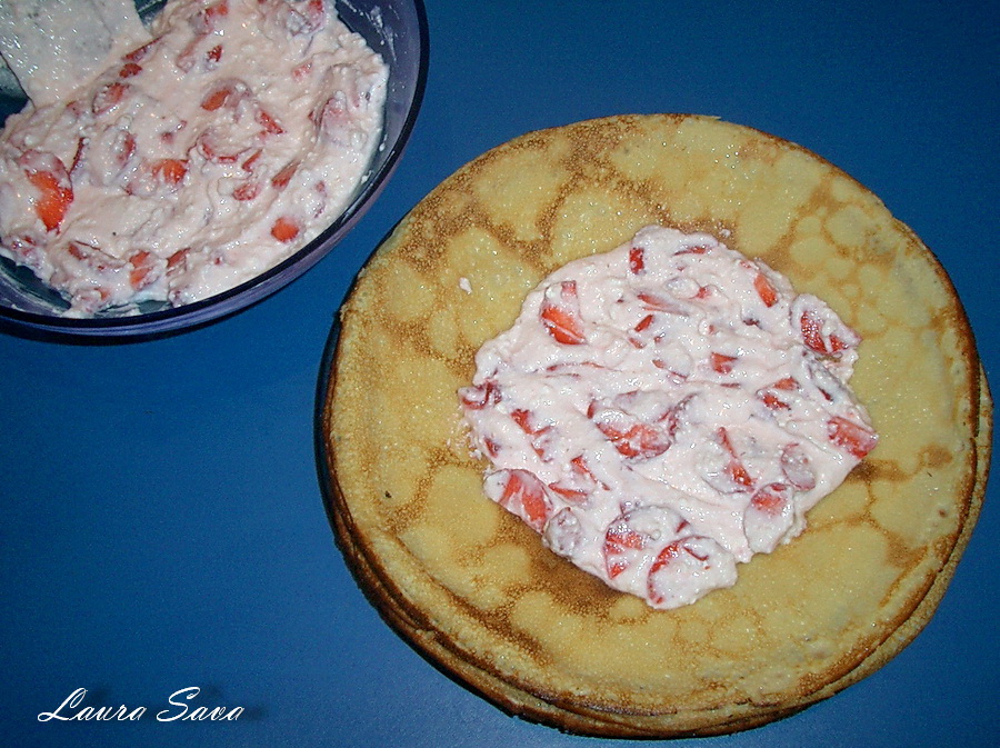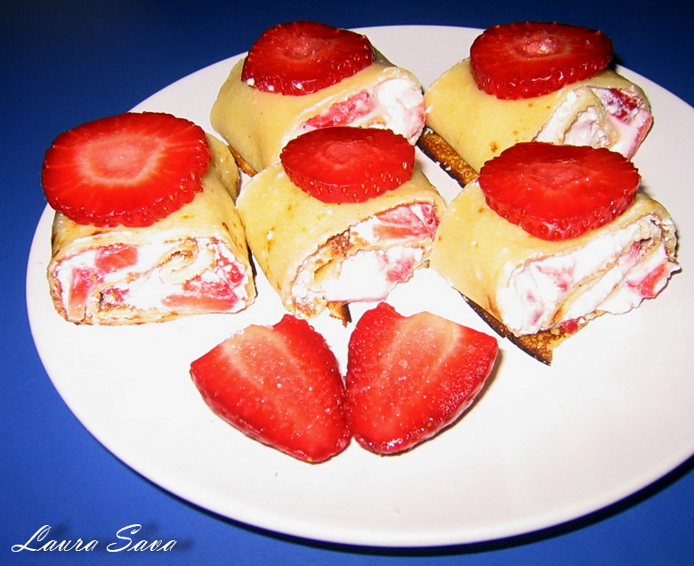 Clatitele se umplu cu crema si bucatelele de capsuni si se ruleaza cu grija.