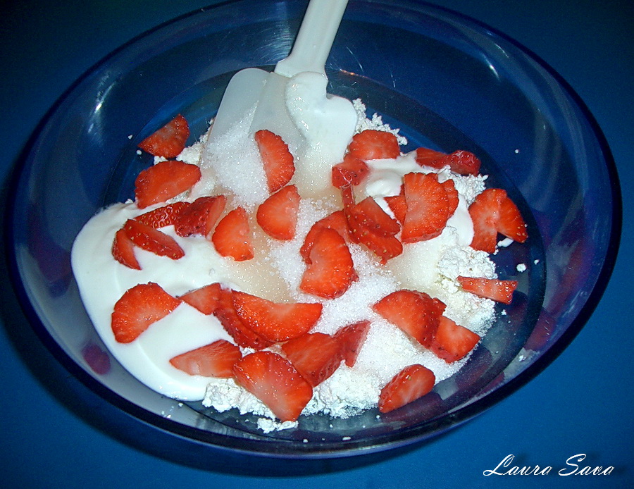 Se curata si se maruntesc capsunile. Se amesteca totul cu grija.