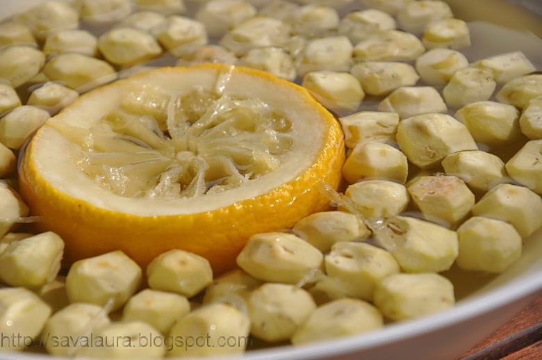 Se spala apoi cu apa rece, si se lasa in apa rece, schimband-o de 2, 3 ori pana cand pregatim siropul. La final, am adaugat o jumatate de lamaie, pentru ca nucile sa isi pastreze o culoare frumoasa, alba: