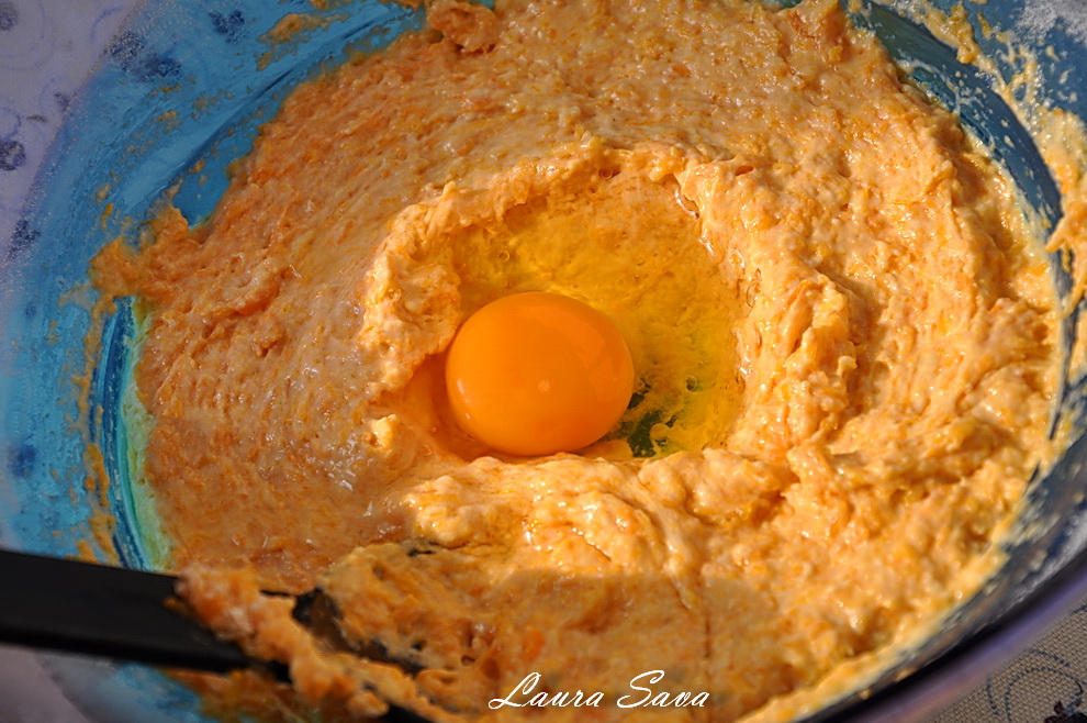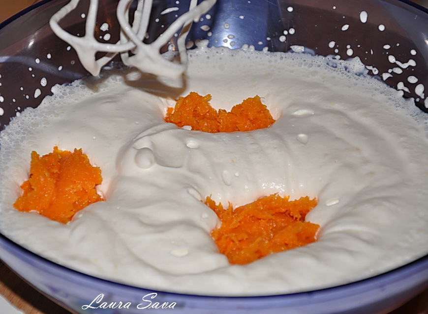 Amestecati apoi, intr-un bol incapator, piureul de dovleac, ouale si uleiul, cu ajutorul mixerului.