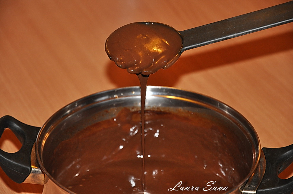 Cand s-a racit, se acopera cu ciocolata neagra topita impreuna cu smantana pentru frisca: