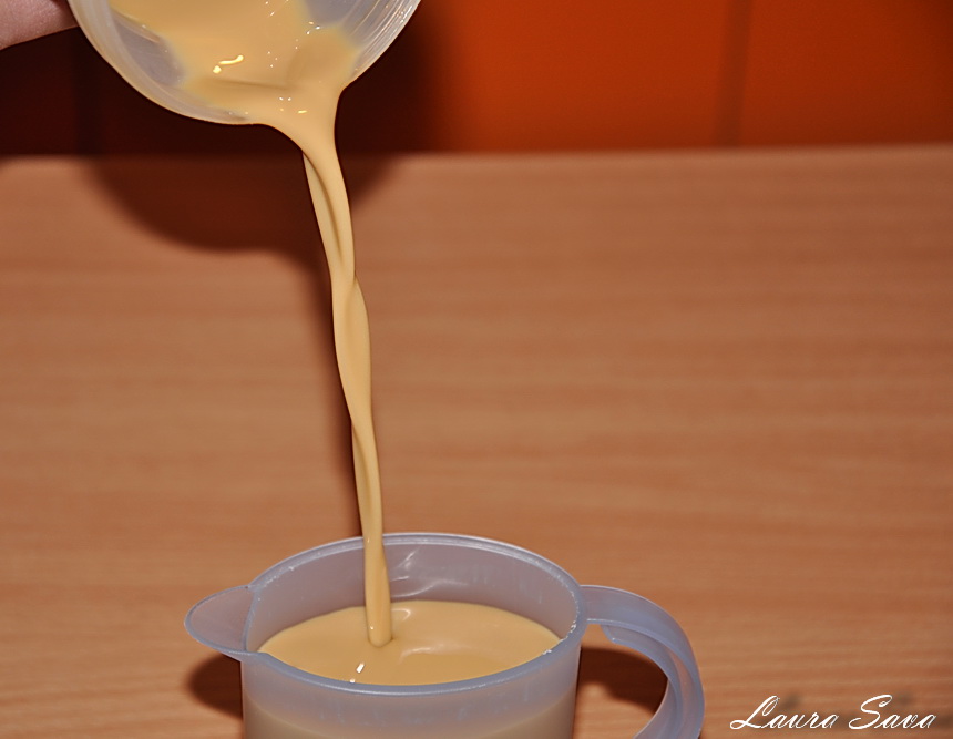 Amestecati cele doua compozitii cu o spatula sau cu mixerul, la viteza mica, dar nu insistati cu mixatul!