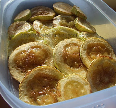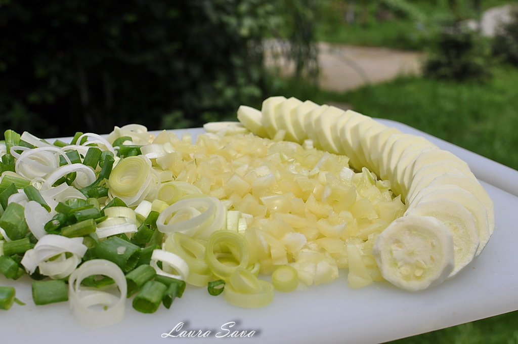Spalati vinetele si dovleceii; feliati legumele pe lung, cu tot cu coaja. Sarati feliile si lasati-le intr-o strecuratoare, la scurs.