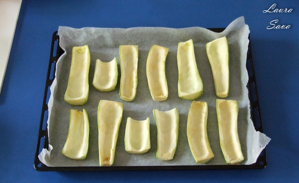 Urmatorul strat este de vinete, pe care le puteti suprapune, ca sa intre toate si un strat de dovlecei, urmate de un strat din cascavalul ras ramas (celelalte 60 de grame).