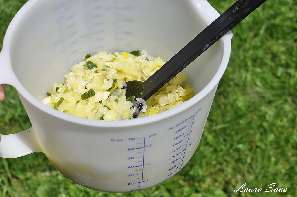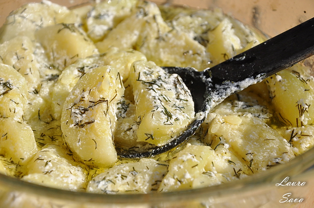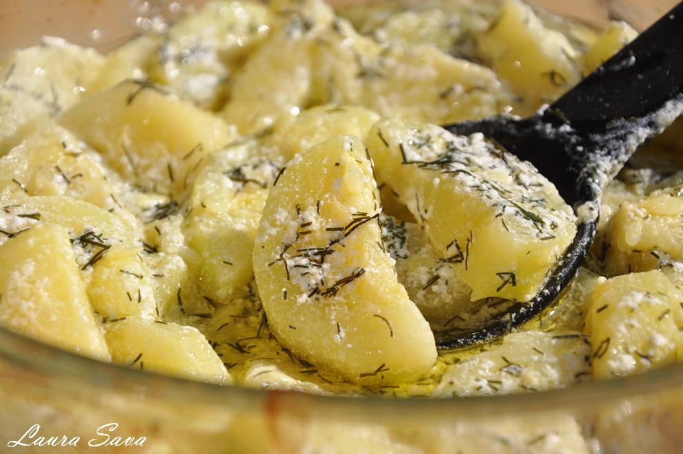 In acest timp, decojiti cartofii, taiati-i pe jumatate (mai ales daca sunt mari) si puneti-i la fiert intr-o oala cu apa si sare. Nu ii fierbeti complet dar sa fie totusi moi, sa puteti infige furculita in ei. Lasati-i sa se raceasca si taiati-i in felii subtiri.