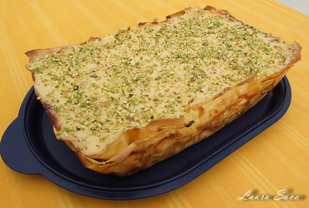 Se lasa la racit cca 10-15 minute, timp in care se prepara sosul de vanilie cu suc de caise: se taie cu cutitul fisticul; se unge lasagna cu sos si se presara deasupra fisticul, cand este suficient de rece, si cca 10 g de zahar pudra.