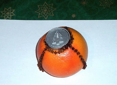 Infigeti cuisoare pe conturul cercului, in jurul lumanarii, precum si pe liniile ce impart portocala.