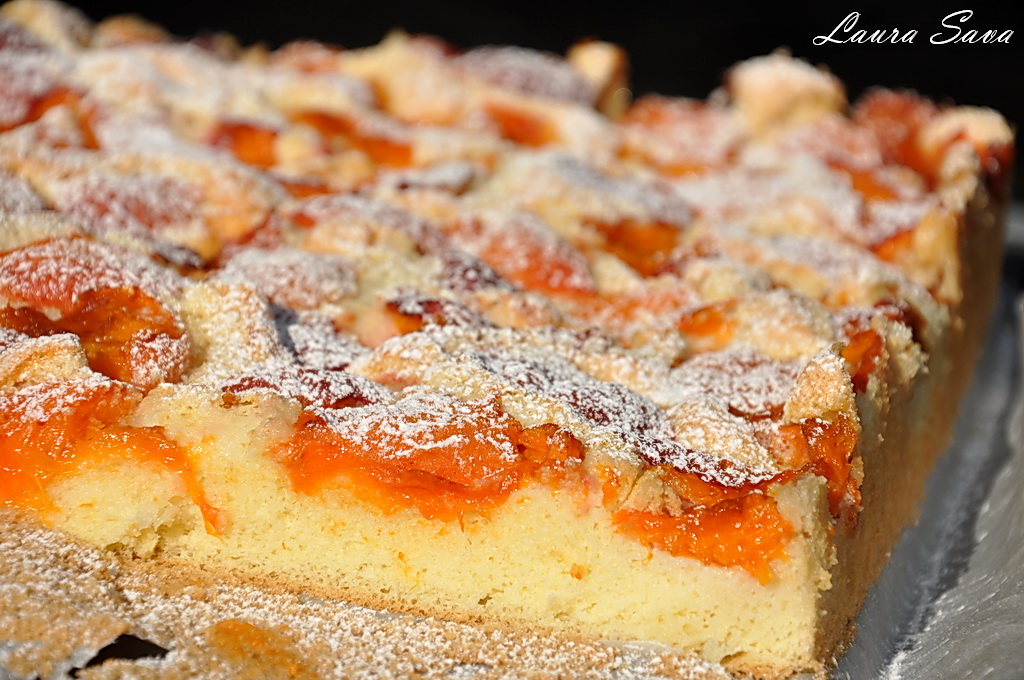 Se adauga galbenusurile si faina, cernuta, si se amesteca totul usor, cu o spatula, cu miscari de jos in sus, exact asa cum am mai spus aici: Pandispan  Aluatul obtinut se toarna in forma pregatita si se niveleaza. Se aseaza caisele pe toata suprafata blatului (nu se imping in aluat)…eu am folosit 1 kg de caise si le-am cam inghesuit, dar a iesit ataaat de bun!!!! 😛