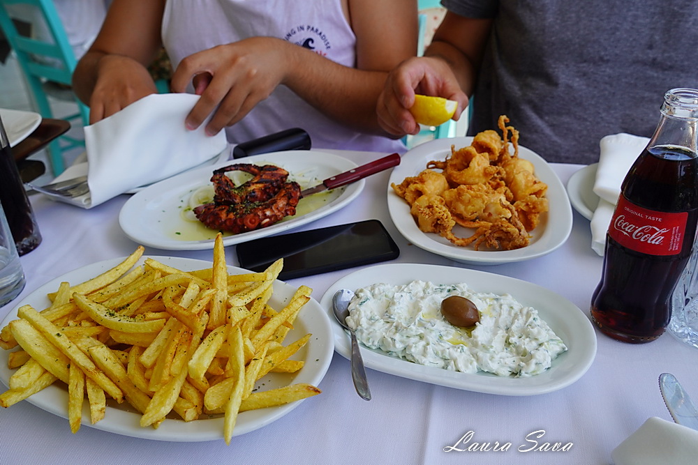 Am comandat, ca de obicei, calamari, caracatita si peste. Cu legume la gratar, tzatziki si nelipsitii cartofi prajiti cu Cola :))