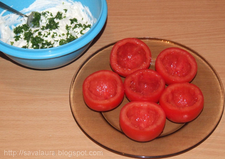 Si apoi se umplu cu compozitia pregatita. Se presara deasupra piper si frunze de busuioc sau fire de marar. Daca vreti, puteti servi rosiile pe frunze de salata (foile de salata se sterg si se aseaza decorativ pe un platou. Deasupra se aseaza rosiile umplute). Eu le-am lasat simple: