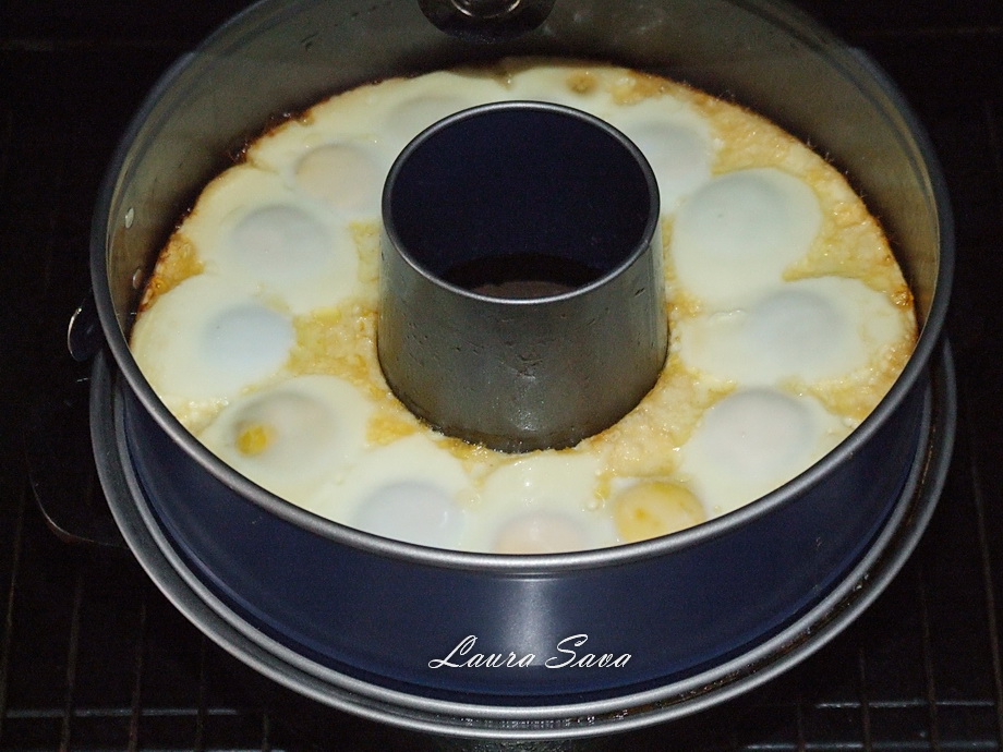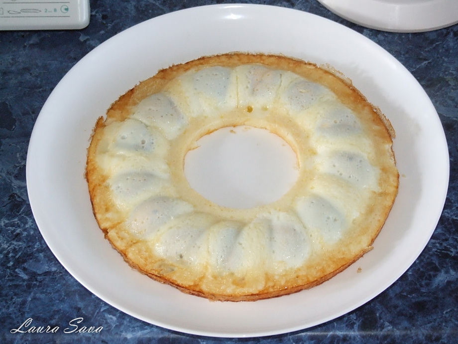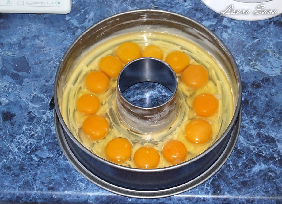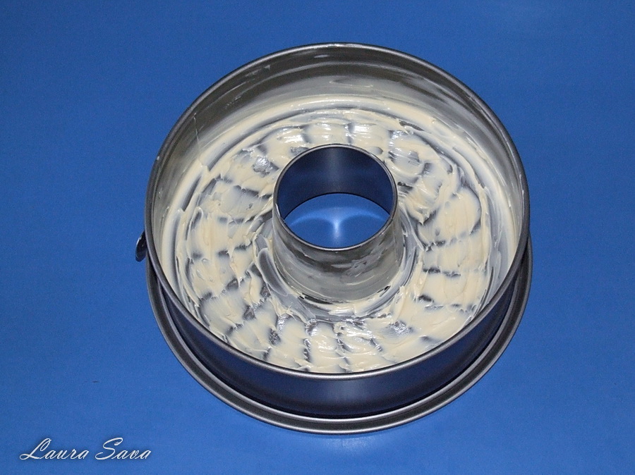 Se unge o forma de guguluf, rotunda (continut de 1 1/2 l) cu unt. Eu am folosit forma mea „inel”, sau altfel cunoscuta ca Bundt: