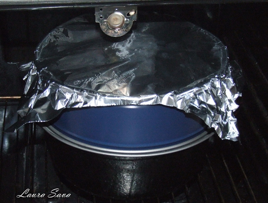 …cat despre forma,ai zis bine 😛 – o pui intr-o cratita mai mare, cu apa destula dar totusi nu cat sa ajunga pana la forma, adica e foarte important ca apa sa nu atinga fundul formei, asta am vrut sa zic 🙂