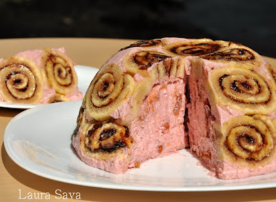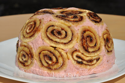 Tapetati un castron, stropit cu apa, cu folie transparenta de bucatarie. Asezati felii de rulada la baza si pe marginile castronului, cat mai aproape unele de altele. Umpleti cupola cu crema de branza.