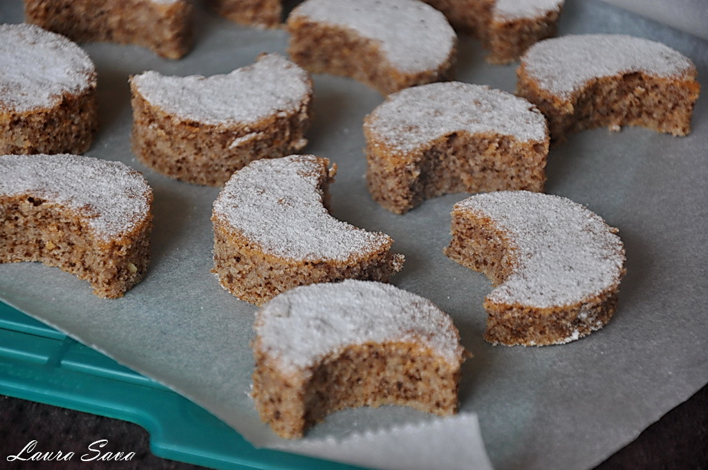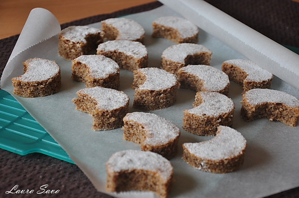 Dragilor, la noi a venit iarna!!!! Si daca ieri urmaream, fericiti, de pe fereastra, cum pica, pufosi, fulgii de nea, astazi am avut parte de prima ninsoare adevarata. Ninsoare ce s-a lasat cu o bataie cu bulgari, si cu un Bogdi cu gura pana la urechi (nu-l vad prea des, in drum spre scoala, in starea asta 😀 ), ceea ce mi-a umplut inima de bucurie. Asa ca, am fugit rapid sa va pozez gradina ninsa si sa va aduc cele mai bune semiluni cu nuca din lume!!!!!