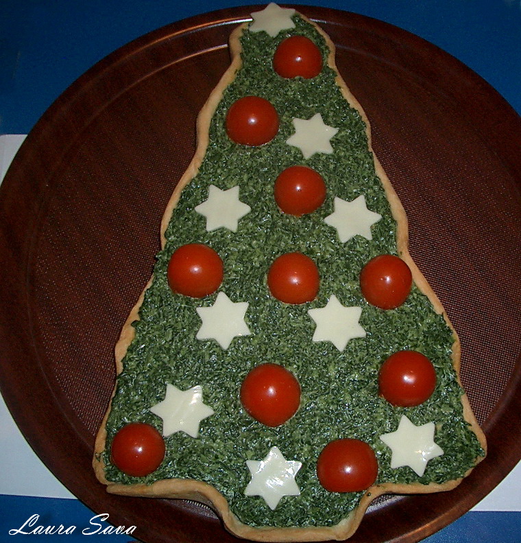 Iar daca vreti sa folositi umplutura „originala”, urmati pasii de aici: spanacul se paseaza cu ulei, cascaval, otet, sare, piper si samburi de pin. Se umple tarta cu spanac si se orneaza cu rosii si stelute de cascaval, ca si mai sus.