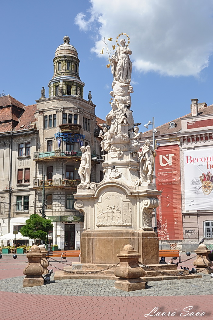 Monumentul „Sfanta Treime”, cunoscut si ca „Statuia Ciumei”, coloana ce aminteste de incetarea epidemiei de ciuma din Banat (anii 1731-1738) in prim-plan. In spatele ei se zareste Domul romano-catolic: