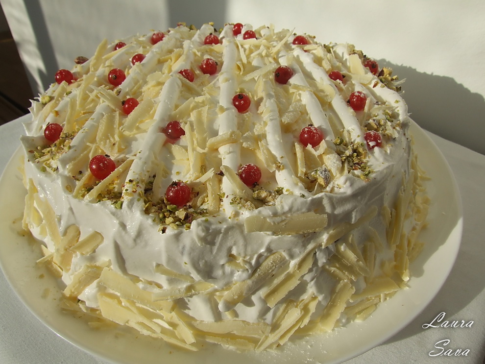 Tort alb cu blat de nuci si coacaze: un rasfat dulce, un tort „de zapada” 🙂 …pentru toti iubitorii de nuca si crema bogata de branza si fructe, cu aroma de vanilie.
