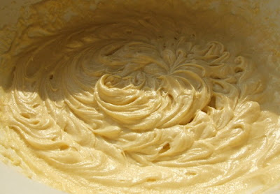 Bateti untul cu zaharul pana se spumeaza; adaugati unul cate unul, ouale, si amestecati energic (cu mixerul). Cerneti faina impreuna cu praful de copt si adaugati-le in compozitie odata cu praful de sare (cat luati cu doua degete). Adaugati laptele si amestecati bine: