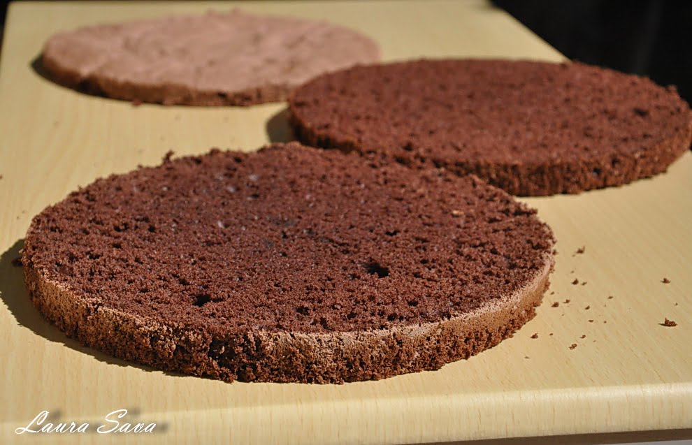 Taiati blatul in trei parti egale cu un feliator de torturi. Daca nu ati vazut pana acum unul, va spun eu cum sa-l depistati 😛 E un „fierastrau” dotat cu o sarma subtire care feliaza perfect blaturile, ca aici: Tort de dovleac cu crema de whisky.