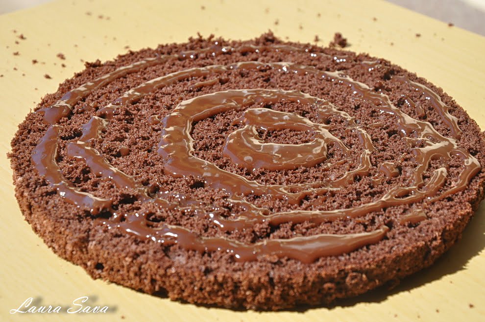 Impartiti crema de alune in doua. Cu o parte, ungeti blatul de jos si cu cealalta parte blatul din mijoc. Nu uitati sa „stropiti” blaturile cu sosul de ciocolataaa!!!! 😀