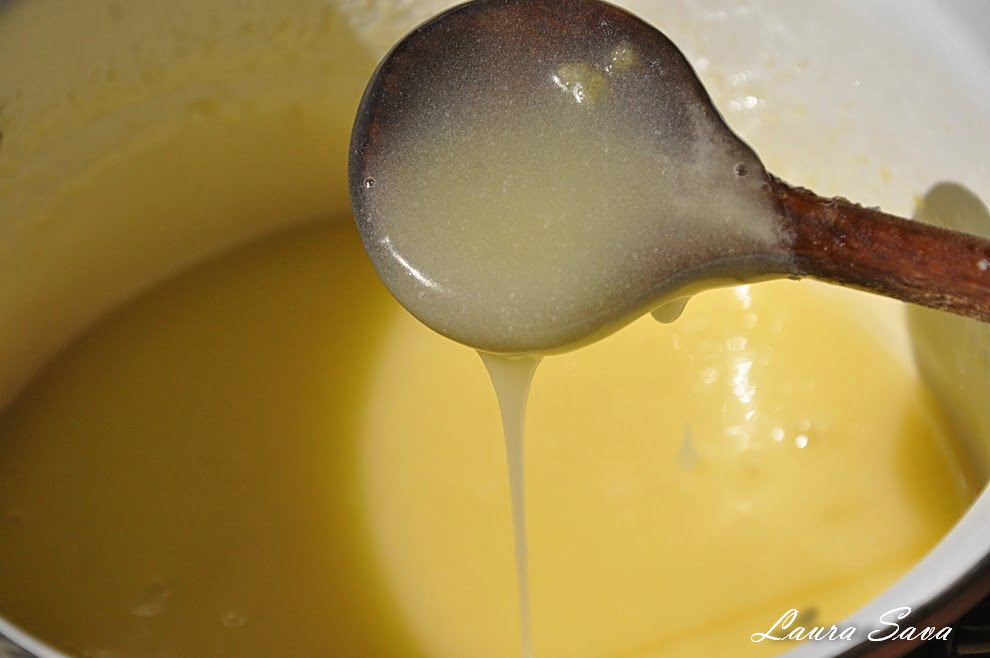 Amestecati des, sa nu faca cocoloase iar cand crema prinde consistenta, scoateti vasul din baia de aburi si puneti-l intr-un altul cu apa foarte rece. In felul acesta, fierberea inceteaza imediat (se stie ca si dupa ce luati o crema de pe foc, ea continua sa fiarba).