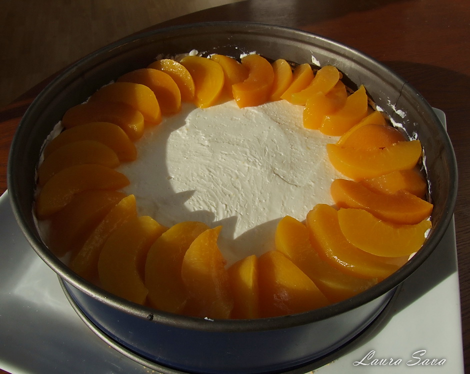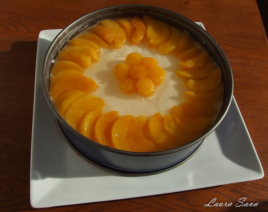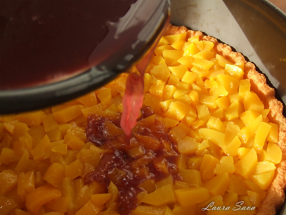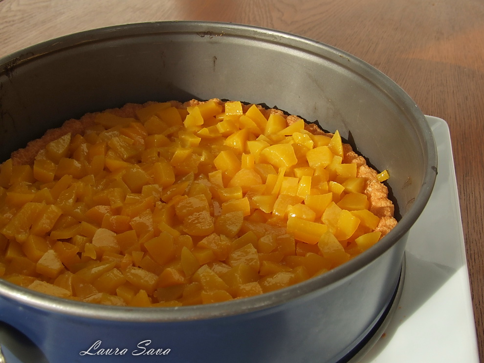 Se aseaza in jurul blatului un inel si se aseaza deasupra nectarinele/piersicile taiate cuburi.