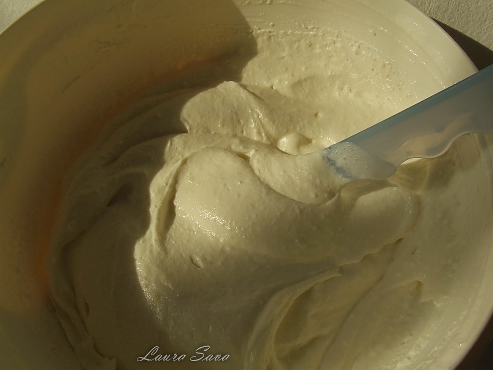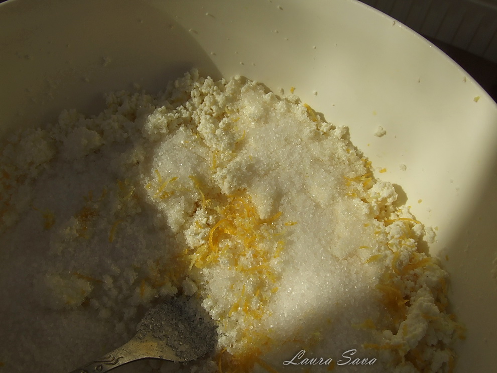 Branza Mascarpone sau branza de vaci, cum am folosit eu 🙂 …se amesteca impreuna cu zaharul, coaja de lamaie si romul: