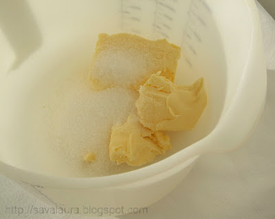 Cuptorul se incinge la 175 grade C (foc potrivit). Se amesteca faina cu praful de copt si se inglobeaza in compozitie , cu laptele: