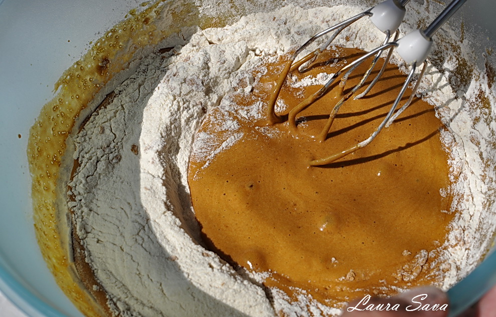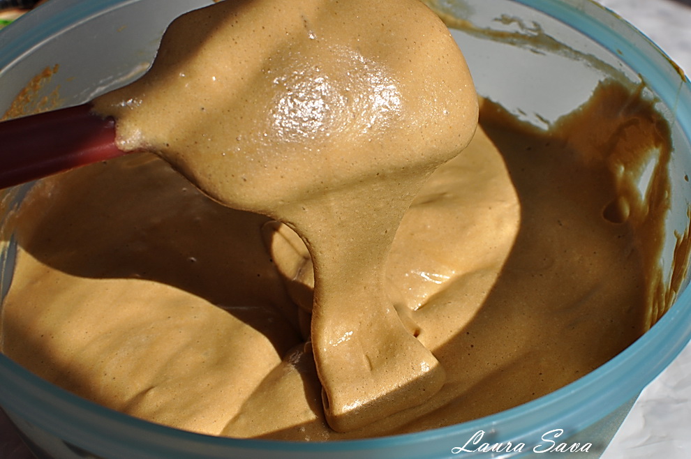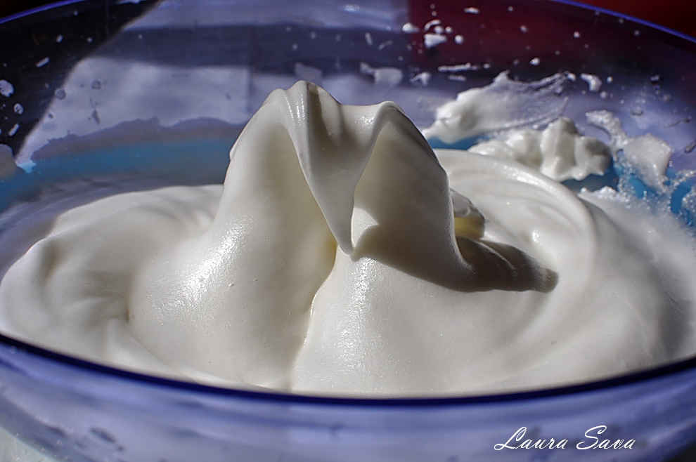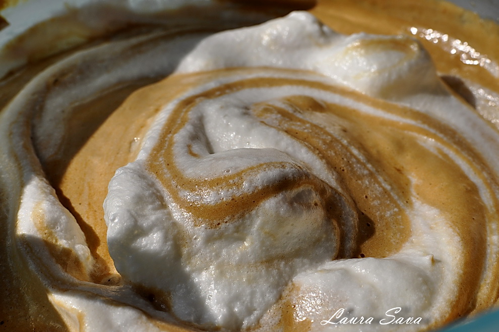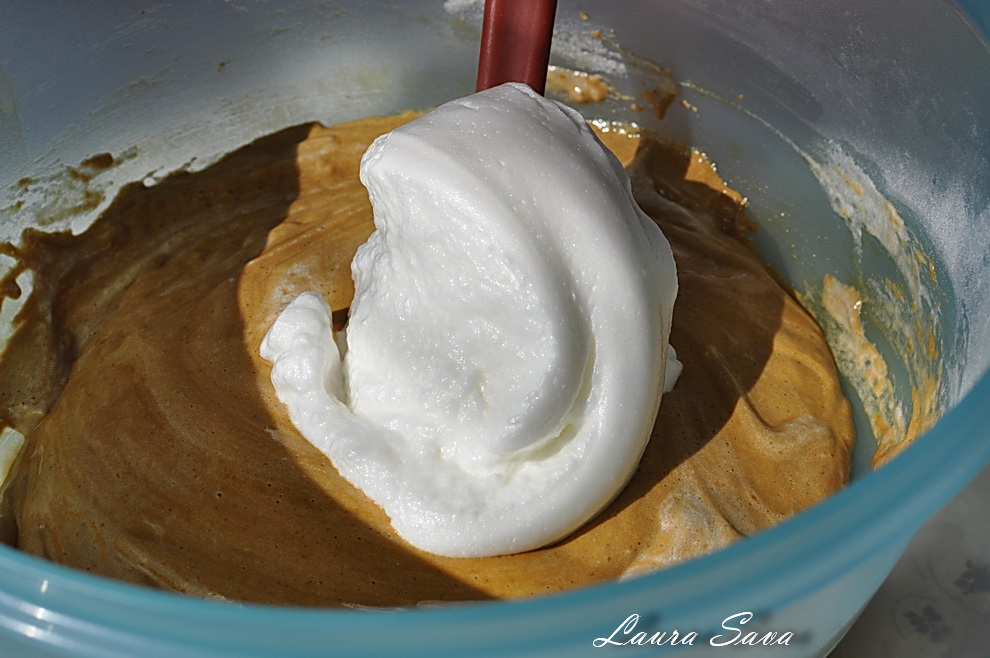 Adaugati apoi spuma de albus si amestecati incet cu o spatula/lingura de lemn: