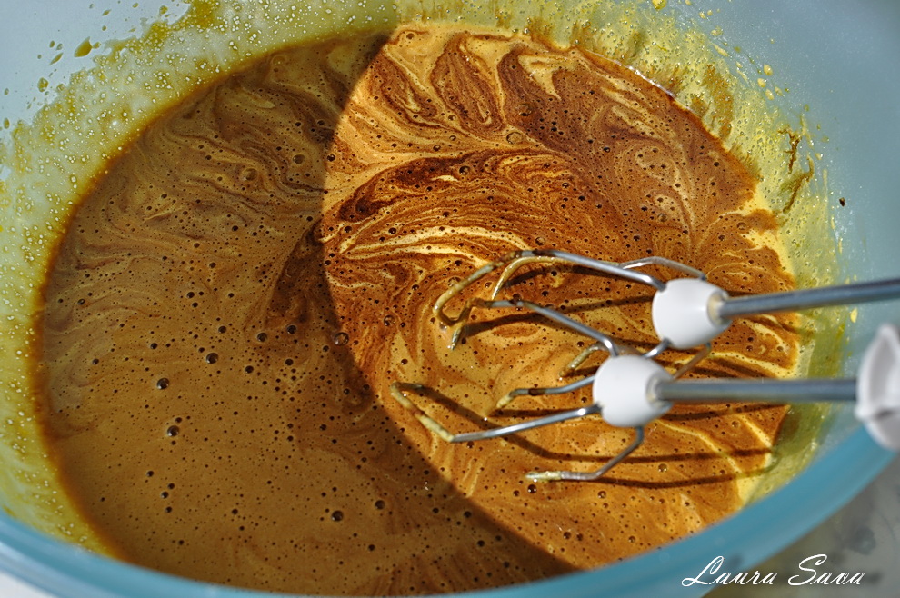 Faceti o crema din galbenusuri, restul de zahar, zahar vanilat si cafea: