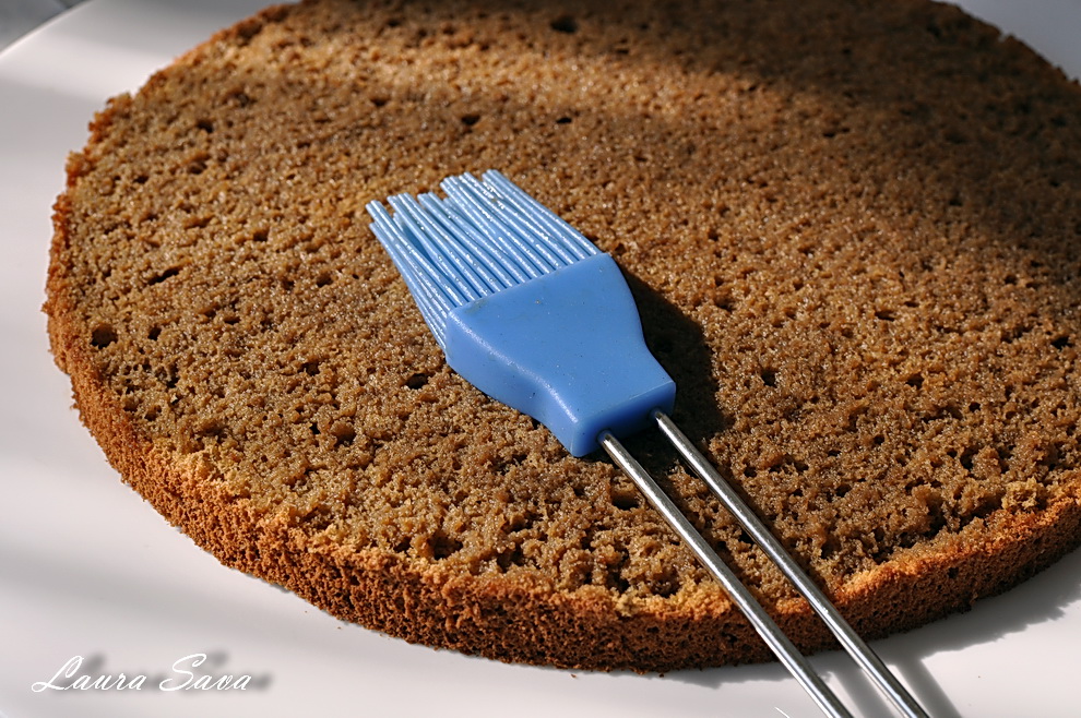 Dizolvati cafeaua instant in 75 ml de apa fierbinte, amestecati cu zahar pudra si coniac (rom). Insiropati blatul cu acest amestec: