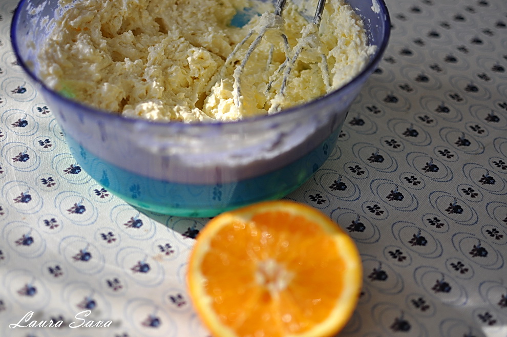 Spalati cu apa fierbinte portocalele. Razuiti aproximativ o lingurita de coaja (numai daca sint bio) Stoarceti o portocala si jumatate. Amestecati branza mascarpone cu branza de vaci, zaharul, coaja rasa de portocale si sucul: