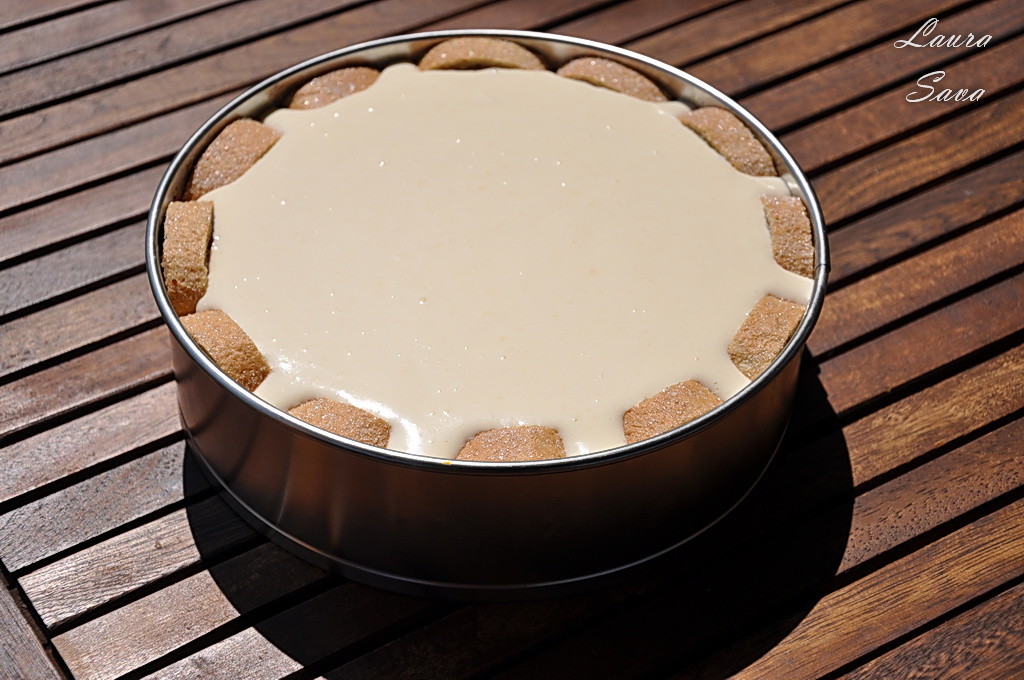 Asezati blatul de pandispan la baza formei, apoi insiropati-l cu suc proaspat de portocale. Daca aveti un platou mare (si drept, fara adancituri), puteti pune blatul de pandispan direct pe platoul de servit.