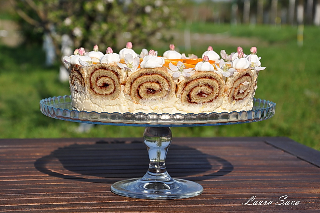 Va servesc repede, repede (cuptorul meu e-n flacari 😛 ) cu o feliuta proaspata din tortul acesta minunat cu rulada si crema de iaurt si portocale, tort care va sta pe masa noastra festiva de anul asta (din care cauza nu am nici sectiune 😀 ).