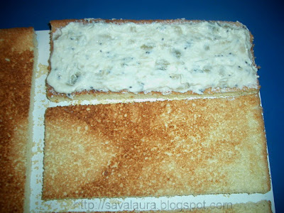Apoi, fiecare mini-rulada se taie in 4 felii subtiri (cu un cutit bine ascutit sau zimtat):