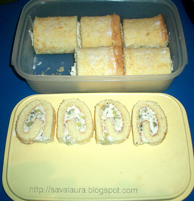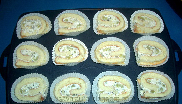 Apoi, fiecare mini-rulada se taie in 4 felii subtiri (cu un cutit bine ascutit sau zimtat):